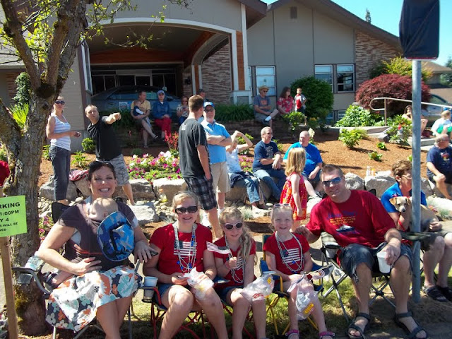 Last year I missed the parade. Joel took the girls, but I was in the hospital, pregnant with Dash, recovering from yet another operation the night before. This year I was a bit overwhelmed at how much things have changed since then...being there for this family tradition and hearing Dash laugh with glee as he played with his sisters and waved his flag.